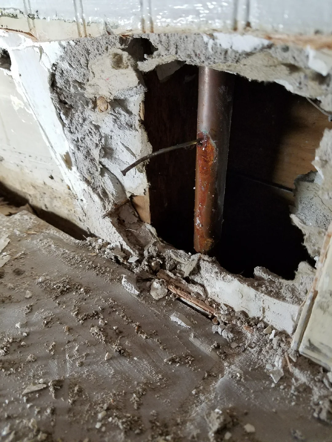 The electrician discovered this nailed pipe while snaking new wires through the walls of an old home. Not pictured is the nice looking piece of wood trim the carpenter unwittingly nailed into the pipe. The nail was simultaneously corking the hole it created in the pipe while slowly rusting away. This is like a time bomb. Once the tip of the nail rusts away there would have been a significant flow of water out of the hole and major damage would be caused by that. Luckily the issue was discovered before it was too late. I was able to harmlessly fix it by cutting out the punctured area and soldering a high quality fitting in place.